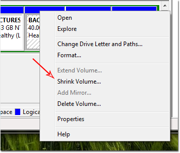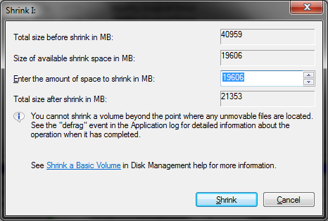 در کادر سوم (که های لایت است) باید مقدار فضایی که قصد داریم از پارتیشن حذف کنیم را وارد کنیم. به صورت پیشفرض مقدار کل فضای خالی آن پارتیشن را مشاهده میکنید. اما مثلا اگر بخواهیم 100 مگابایت از این پارتیشن را کم کنیم، عدد 100 را تایپ و روی دکمهی Shrink کلیک میکنیم.