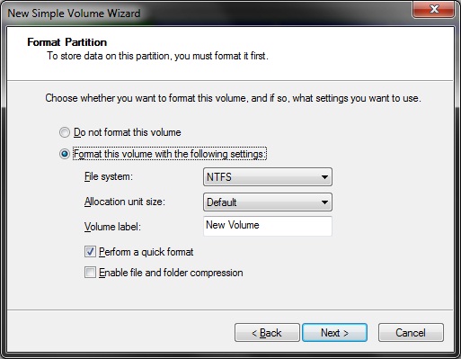در پنجرهی زیر باید نوع پارتیشن (NTFS یا Fat) را انتخاب و آن را فرمت کنیم. و نامی هم برای آن انتخاب کنیم. در ویندوزهای قدیمی کمتر NTFS انتخاب میشد اما برای زمان الان شاید بهتر است همان را انتخاب کنیم.