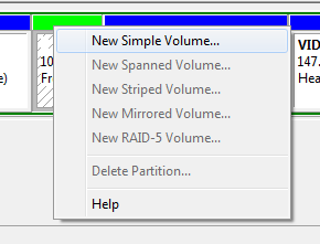 خب این پارتیشن فعلا قابل استفاده نیست. چون فقط این فضا را از پارتیشن قبلی جدا کردیم و هنوز فرمت و آدرسدهی نشده که ویندوز بتواند آنرا بشناسد. برای اینکه به پارتیشنی فعال تبدیل شود، روی آن کلیک راست کرده و روی گزینه New Simple Volume کلیک میکنیم.