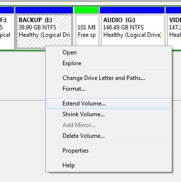 اما اگر بخواهیم یک قسمت خالی از هارد را (همان قسمتهای سبز رنگ) را به پارتیشنی دیگر وصل کنیم، باید روی پارتیشینی که میخواهیم به آن اضافه کنیم کلیک راست کرده و روی گزینهی Extend Volume کلیک کنیم.