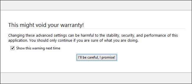 اینجا تمام تنظیمات فایرفاکس زیر دست شما قرار میگیرد. پس در هنگام تغییر تنظیمات دقت کنید مبادا فایرفاکس ایراد پیدا کند. به همین دلیل پیغام هشداری هم نمایش داده میشود که باید روی دکمهی “I’ll be careful, I promise!” کلیک کنید: