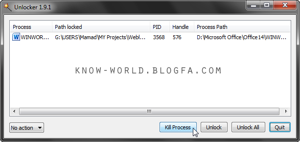 میتوانید با کلیک روی هر برنامه و بعد کلیک روی دکمهی Kill Prosecc هر پردازشی را ببندید تا فایل آزاد شود. به این ترتیب برنامهای که مشغول استفاده از فایل بود بسته میشود. همینطور میتوانید به جای بستن پردازش و برنامه فقط فایل را آزاد کنید و نیازی به بستن برنامه و پردازش نیست. با کلیک روی دکمهی Unlock پردازش مورد نظر بسته میشود. با کلیک روی دکمهی Unlock all همهی پردازشهایی که به فایل شما ربط داشته و در این جا لیست شدهاند بسته میشوند.