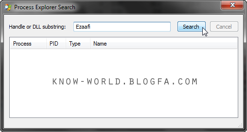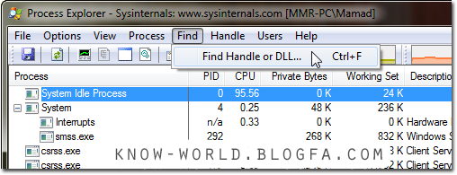 بعد از منوی Find گزینهی Find Handle or DLL… را انتخاب کنید. (یا کلیدهای Ctrl+F را فشار دهید)