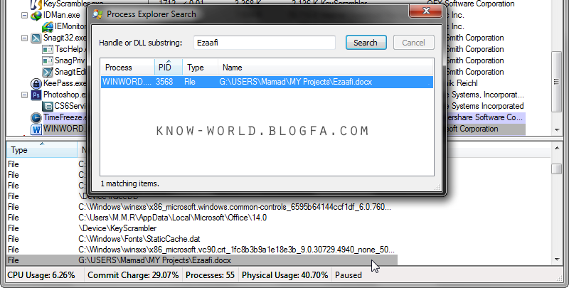 لیستی از برنامهها و پردازشهایی که روی فایل در حال اجرا هستند نمایش داده خواهد شد. روی پردازشی که میخواهید بسته شود کلیک کنید. با اینکار در زیر پنجرهی Process Explorer نام پردازش و آدرس آن را بصورت هایلایت مشاهده میکنید.