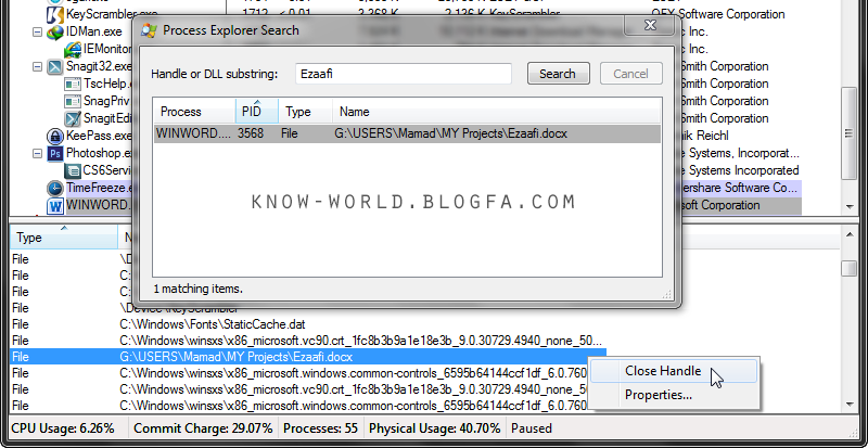 روی همین پردازش کلیک راست کنید و گزینهی Close Handle را انتخاب کنید.