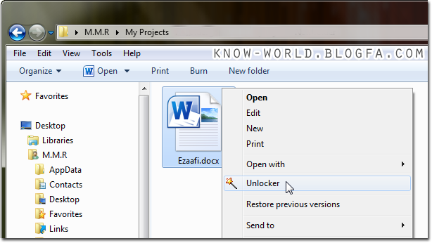 نرم افزار Unlocker یک برنامهی رایگان و کم حجم است که بعد از نصب یک گزینه به منوی کلیک راست ماوس اضافه میکند به همین نام، یعنی Unlocker. چنانچه با اقدام به حذف یا تغییر نام یک فایل یا پوشه همان پیغام ویندوز را مشاهده کردید میتوانید روی آن فایل یا پوشه کلیک راست کنید و گزینهی Unlocker را انتخاب کنید.