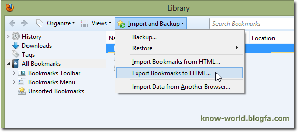 در پنجرهی باز شده روی منوی Import and Backup کلیک کنید و از لیست گزینهی Export Bookmarks to HTML را انتخاب کنید.