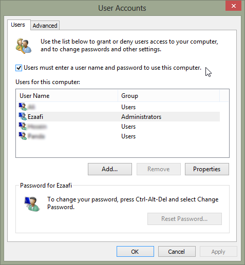 پنجره User Accounts باز میشود. دقت کنید تیک گزینه Users must enter a user name and password to use this computer فعال باشد.