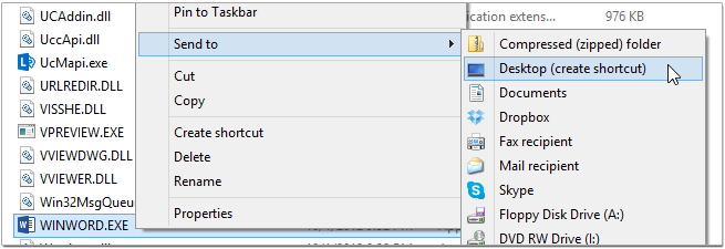 با رفتن به محل نصب آفیس و کلیک راست کردن روی فایل WINWORD.EXE و انتخاب گزینه Send to یک میانبر از آن روی دسکتاپ ایجاد کنید.