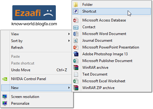 برای شروع نیاز به ساخت یک میانبر دارید. روی دسکتاپ کلیک راست کرده و از منوی New گزینه‌ی Shortcut را انتخاب کنید.