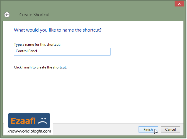 روی دکمه‌ی Next کلیک کنید. حالا باید نامی برای میانبر تایپ کنید. در کادر مخصوص نام، عبارت Control Panel را تایپ کنید.