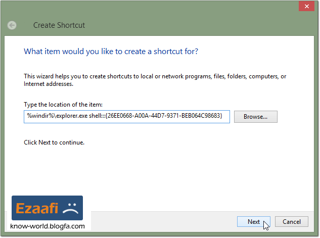 پنجره‌ای برای ساخت میانبر باز خواهد شد. در قسمت مسیر و آدرس این میانبر، عبارت زیر را وارد کنید: