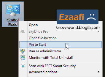 در تنظیمات پیش فرض ویندوز 8 و در صفحه شروع (Start) اثری از فایل اجرایی Control Panel دیده نمی‌شود. اگر تمایل دارید فایل سنتی کنترل پنل را به صفحه شروع ویندوز 8 سنجاق کنید، این مطلب را مشاهده کنید.