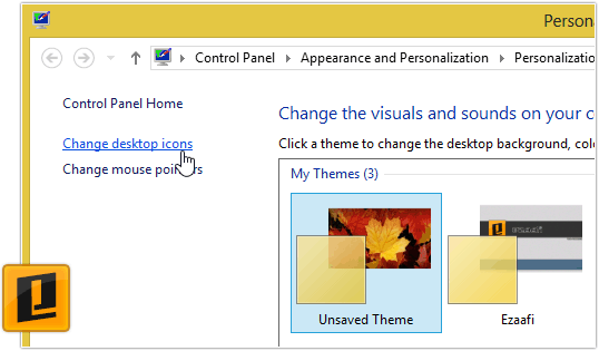 سپس در پنجرهی سفارشی سازی ویندوز، روی لینک Change desktop icons در ستون سمت چپ کلیک کنید.