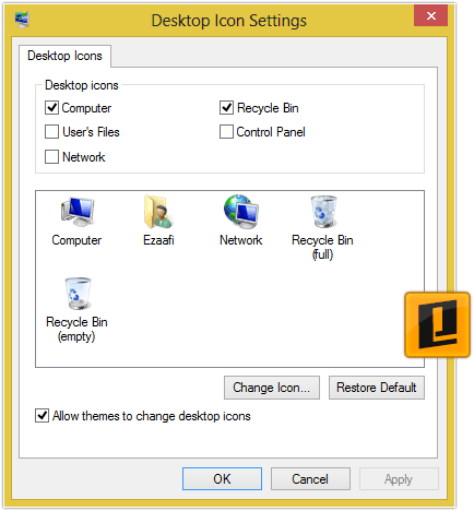 حال آیکونها و میانبرهای عمومی و معمول ویندوز را مشاهده میکنید. هر کدام که تیک آنها فعال باشد روی دسکتاپ وجود دارند و آنهایی که تیک ندارند، روی دسکتاپ نیز نیستند!